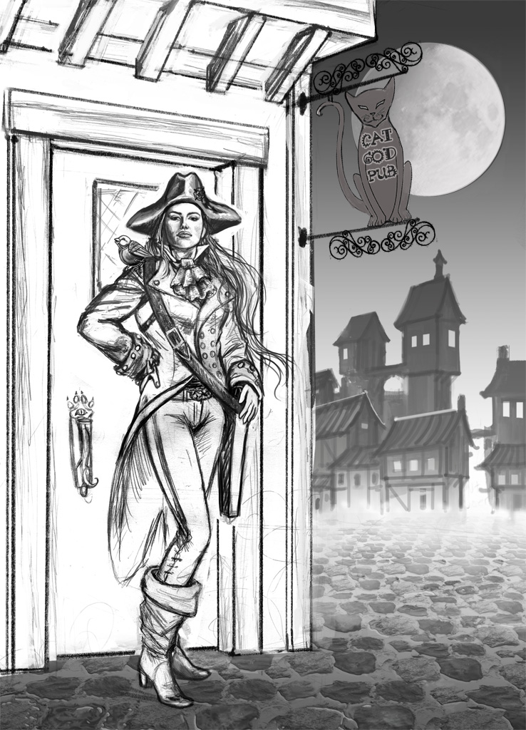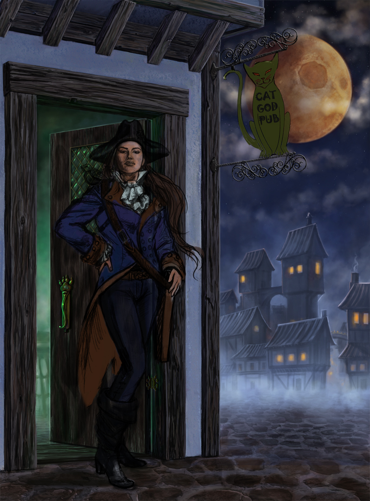 One of the things we’ll be doing is a Live Paint. Artist Carol Phillips will be working on this unfinished pic of Lt. Kilos standing in front of the elusive Cat God Pub, via Wi-Fi and a 17 inch monitor. She’ll even take questions via text while she’s working. It should be lots of fun.
