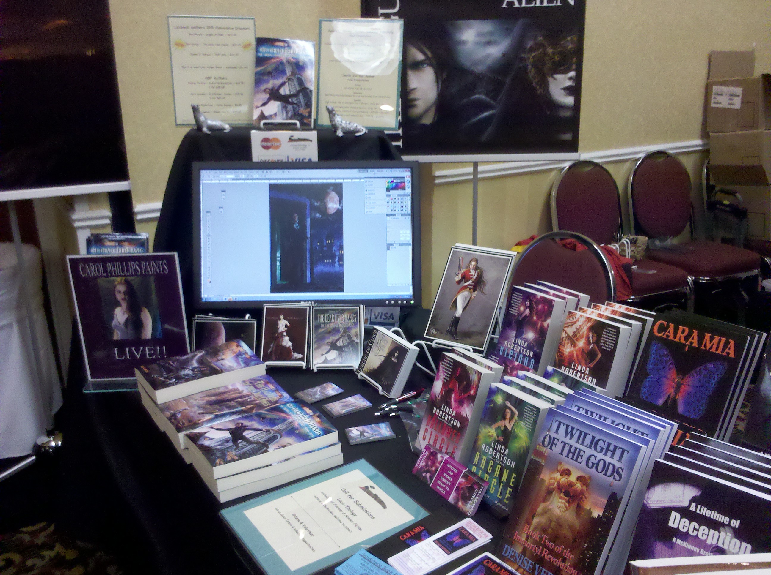 At this convention we had Wi-Fi access and were able to get Carol Phillips, the Queen of the LoE Universe, to do several live paints. I dragged her out of her warm bed on the west coast to work on an illustration and she didn’t disappoint. We beamed her in via web conference and away she went, pulling and dragging, picking up color and causing an attendee at the Con to lose his heart (“She’s a Goddess,” he said).That she is.