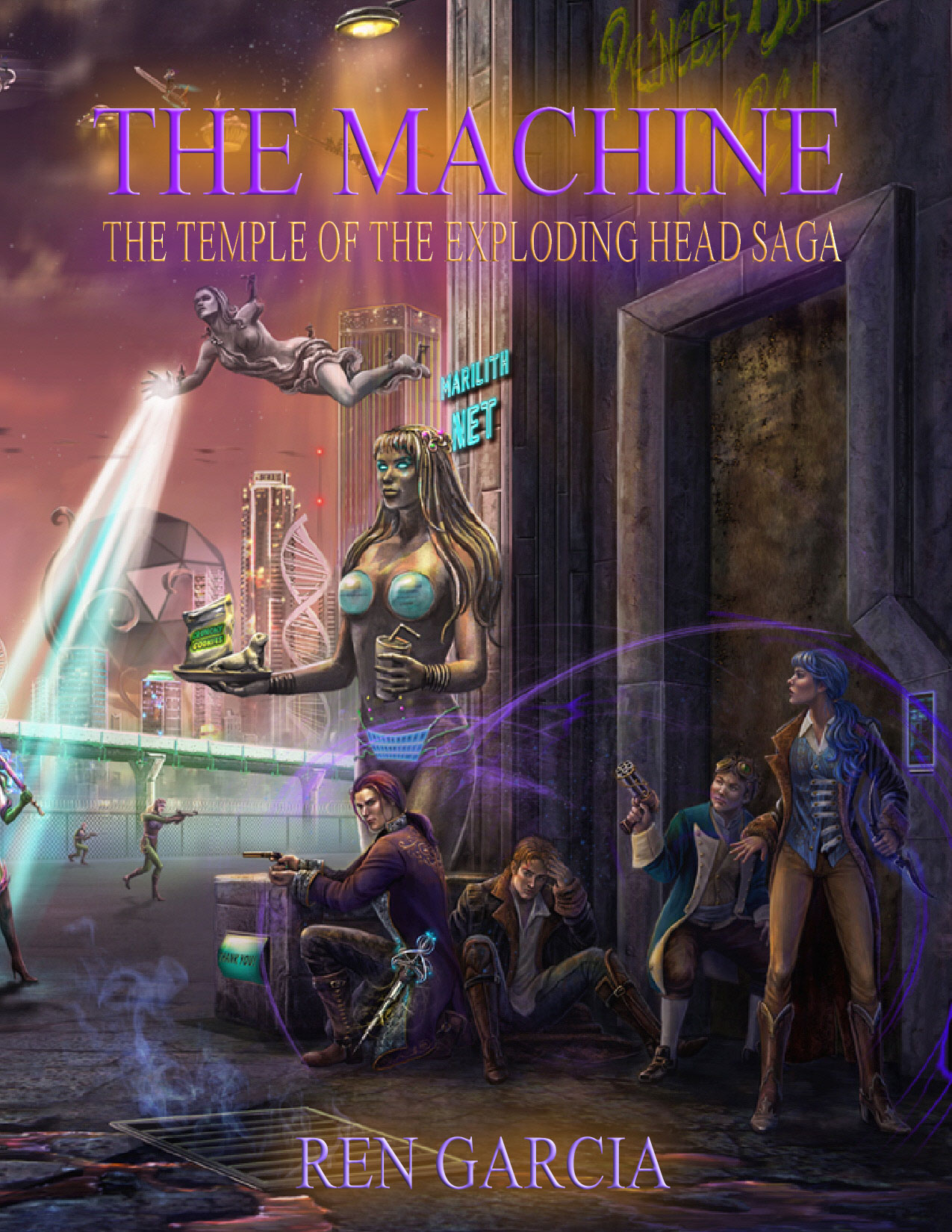 This cover is crawling with a lot of things I’ve always wanted to incorporate in past covers but couldn’t. I love cityscapes. The Book I cover had a cityscape, but that one was the dead city of Metatron. This one is the vibrant, living city of Waam full of the bizarre (like the Princess Marilith vending machine). I also wanted to see Kay, his cousins Sarah and Phillip and Lord Lon–finally from my head to full paint.