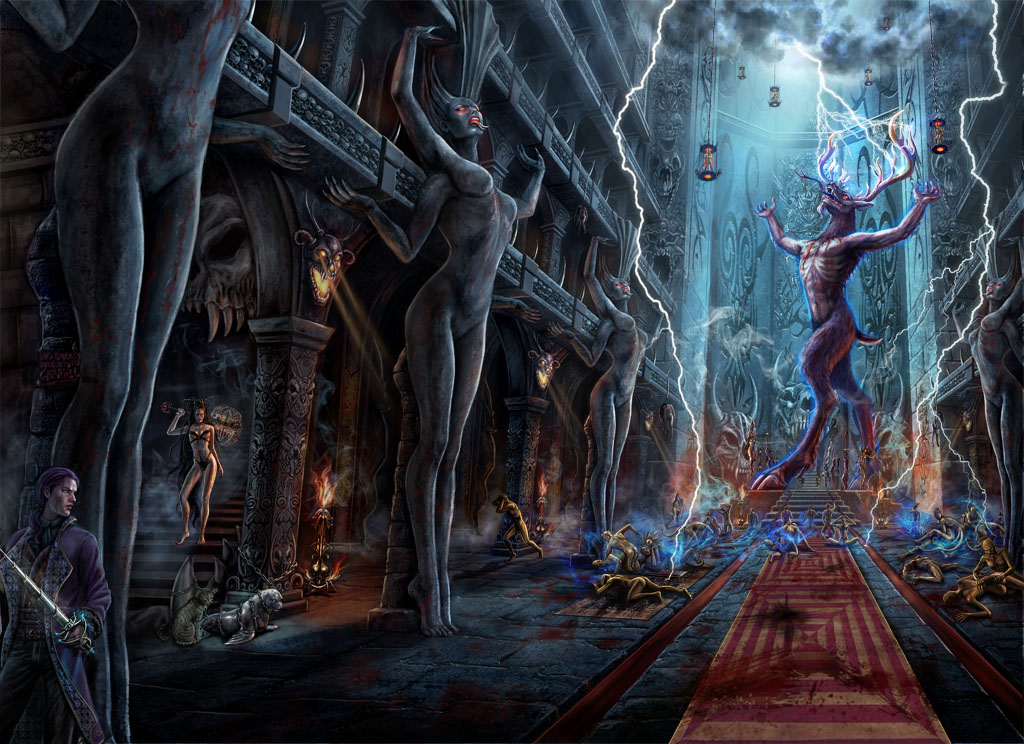 My thought was to place the lettering below the Horned God’s hooves, thereby covering up the mosh pit of worshippers. Carol was appalled and fought to keep them uncovered, besides, the other two books had their lettering in the upper quarter of the cover and Book V needed a similar treatment.