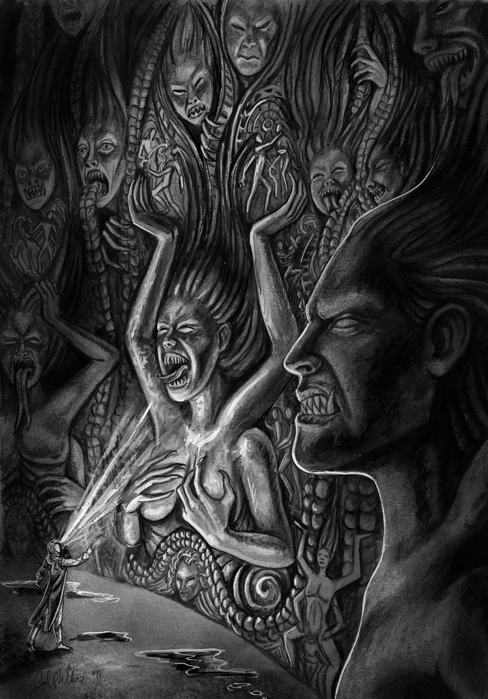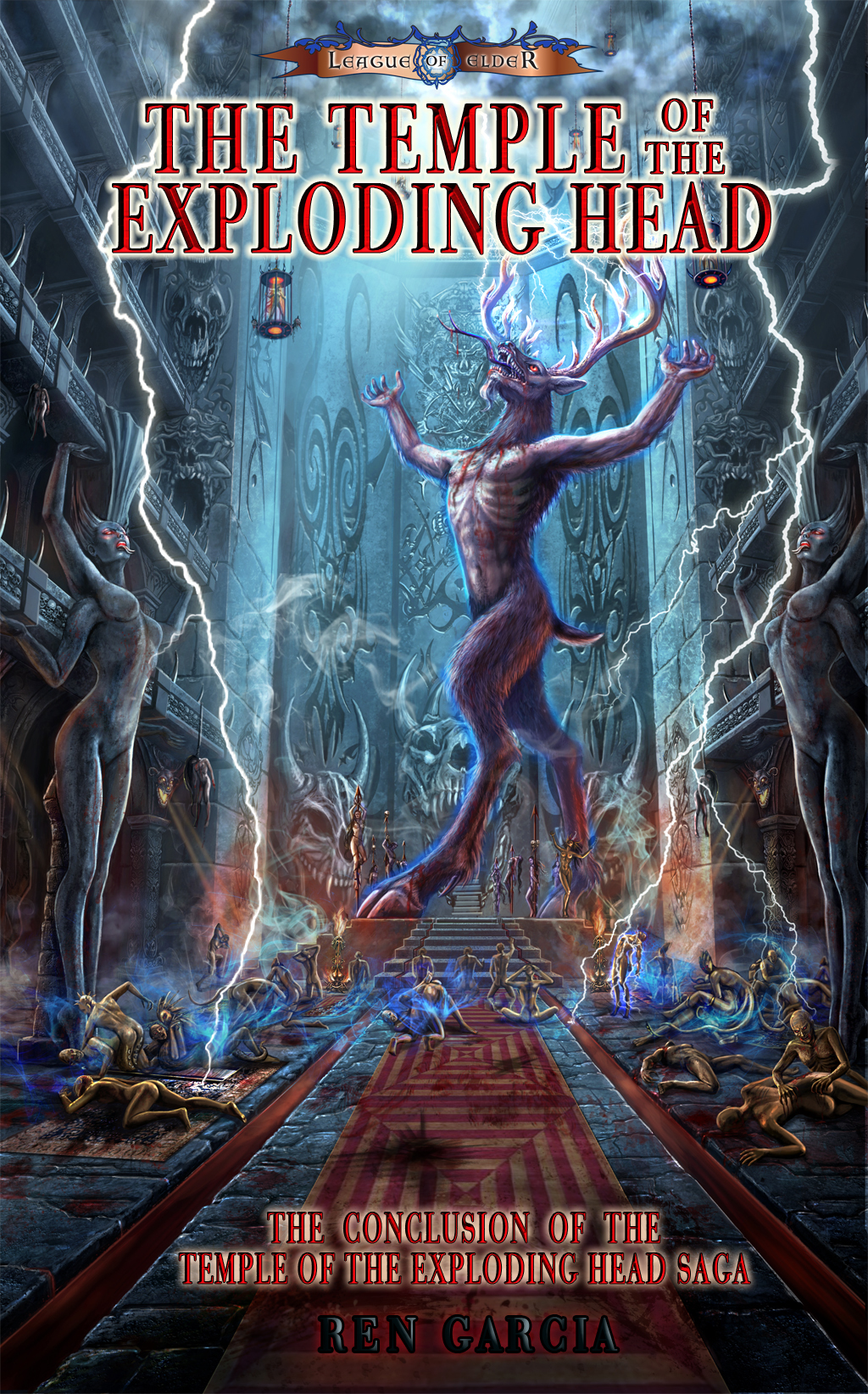 The Main bad Guy of the Temple of the Exploding Head trilogy is the diabolical Horned God. Although his role in the story has changed much since the first draft, his appearance has always been firm in my mind: A gigantic half man/half deer monster full of lust and fury.