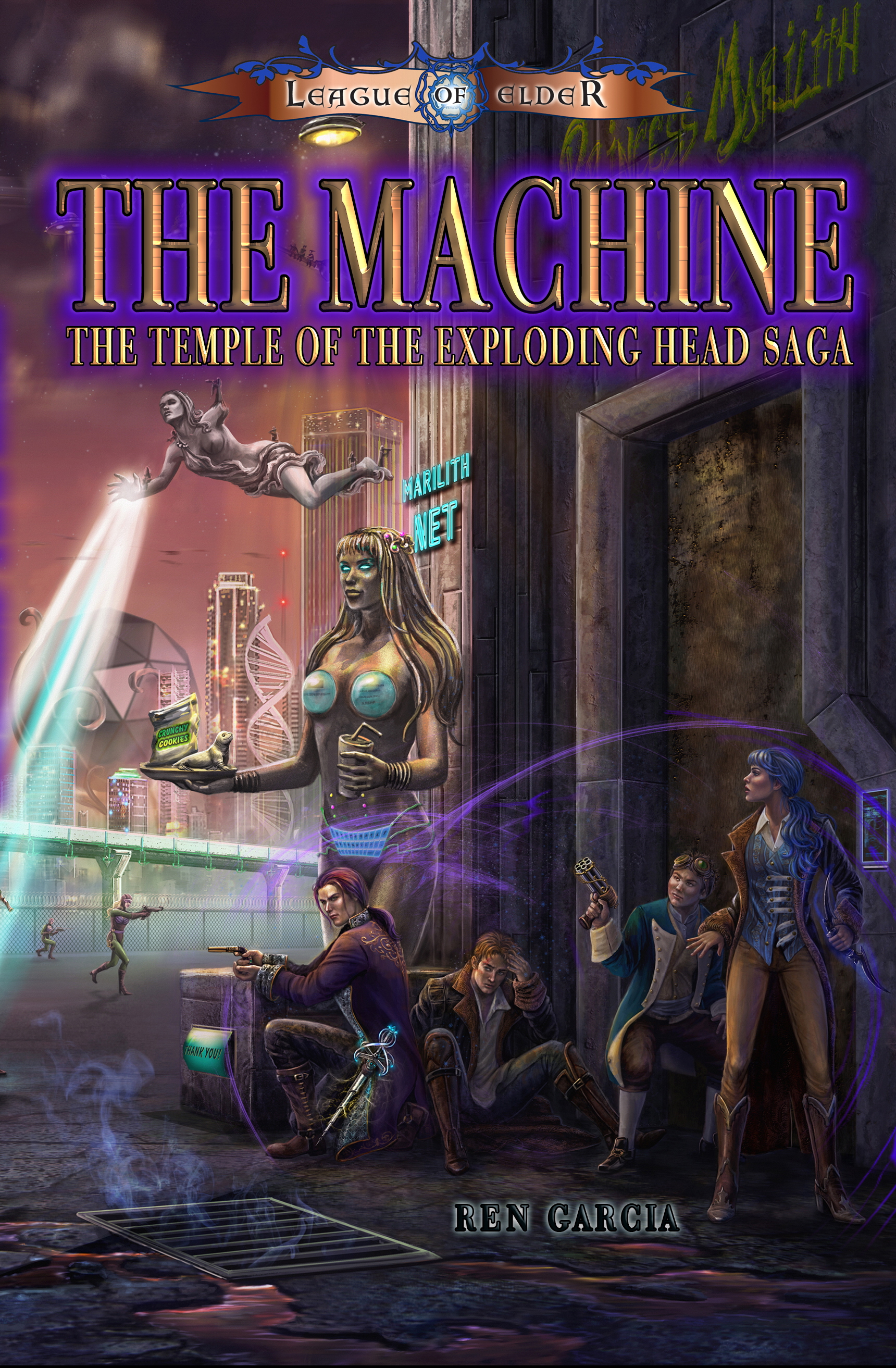 The previous three covers in the League of Elder series have all had a distinct fantasy look to them. For Book IV, I wanted more of a science fiction theme. I love everything about the cover, the colors, the city of Waam all around, the giant-size Princess Marilith vending machine, the flying Bondarunga statue in the background–you name it.