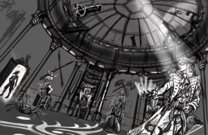 A few things about the Sands. As with the Temple trilogy before it, the Sands was too large to be published as one self-contained book. At 200,000 words, I had to divide it right down the center, with the Sands comprising the first part and Book VII “Against the Druries” being the second. The Sands mostly explores the main character, Lord Stenstrom of Belmont-South Tyrol and how he came to be. He has many secrets (you might notice he’s wearing a mask on the sketch).The cover depicts a scene from the book where Lord Stenstrom, or “Bel” as he’s known is facing death at the Bones Club, a place where the members openly mock and disparage the Sisterhood of Light (If you look carefully at the chairs in the background, you’ll see several Sisters carved in demeaning positions).