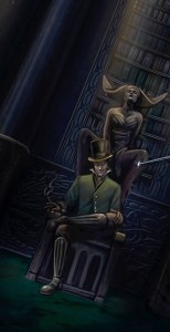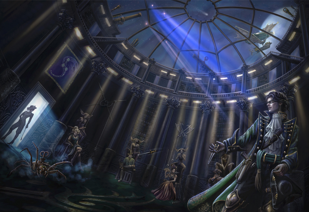 Book VI, “The Sands of the Solar Empire” marks the beginning of the LoE Second Series. You have the same universe, same setting, just a slew of whole new characters and fresh adventures. You’ll meet Lord Stenstrom, a Fleet Paymaster as he takes command of Captain Davage’s old ship, the Seeker. You’ll get to know Private Taara de la Anderson, a thief from Bazz and Lord A-Ram, a fellow from the Admiral’s office as they take on the unknown. The cover for Book VI is the usual wrap-around format. The Second Series takes on a bit more of a Steampunky feel as we move away from Colonial Vithland and examine Victorian Esther and the Calvertlands and dives into the seldom-seen depths of the Bones Club where they openly mock the Sisterhood of Light.It’s a much darker cover than the previous five, even more so than the Temple of the Exploding Head, which is pretty darn dark. It features a steam-driven geared spider with guns, a balloon/air ship and the constellation Camalopardus and the Sanctum Sanctorum of the Bones Club. The Sanctum comes from my recollections of a Masonic temple that I once wandered into, and here it is in full paint, fully steampunked and super-charged a little.